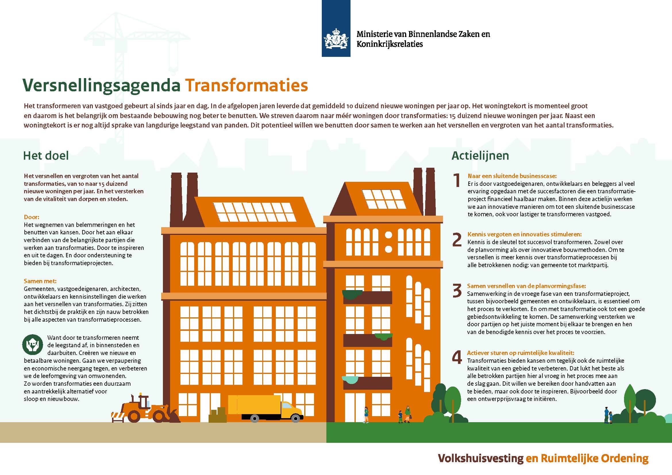 Met de Versnellingsagenda Transformaties werken de overheid, de vastgoedsector en kennisinstellingen intensiever samen om meer en sneller te transformeren. In de Versnellingsagenda staan acties die bijdragen aan: