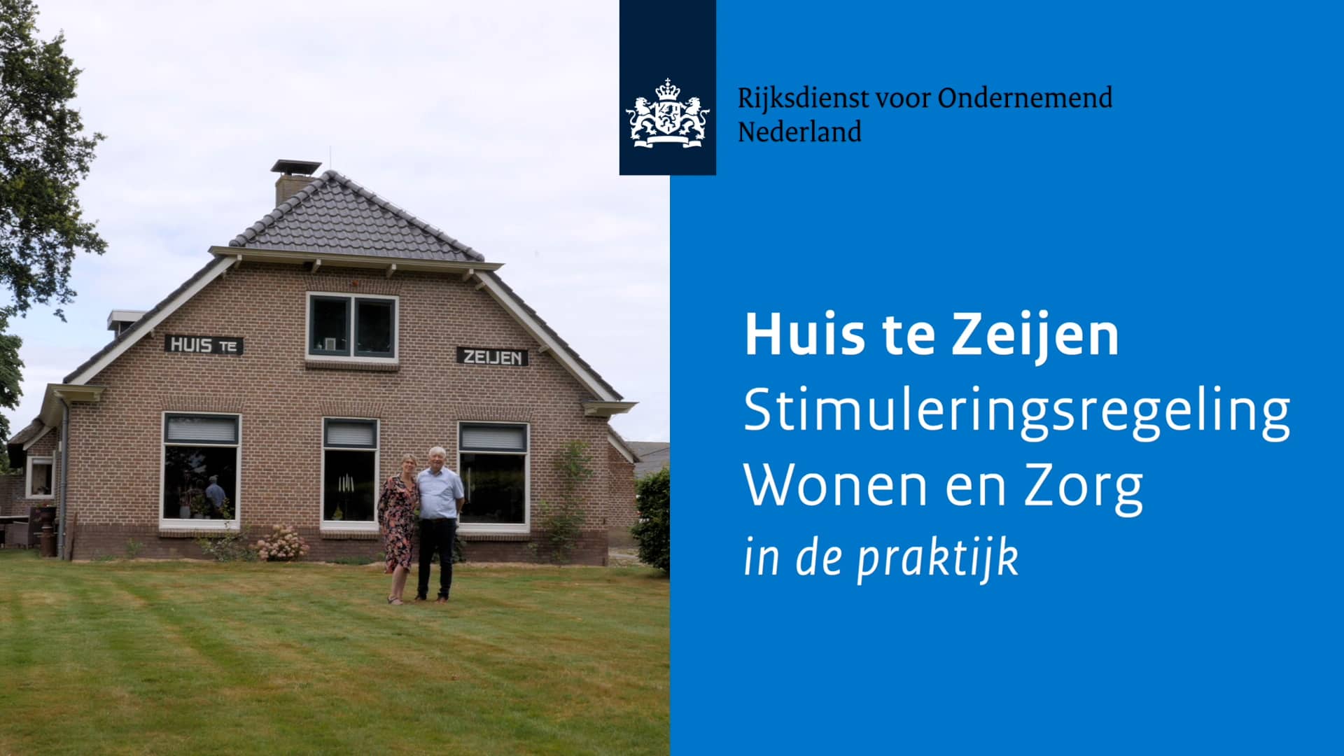*Muziek* Marja Takens – Initiatiefnemer Huis te Zeijen: We zijn hier op het erf van Huis te Zeijen. Ik woon hier samen met Bert, mijn partner, en wij wonen hier 20 jaar. Bert Pathuis - Initiatiefnemer Huis te Zeijen: Ons project, het Huis te Zeijen, dat wordt een nieuwe woonvorm. Vooral bedoeld voor de doelgroep senioren. En wij willen proberen hier in het gebied iets moois te maken waarbij mensen zo lang mogelijk gezond kunnen blijven wonen. *Muziek* Logo Rijksdienst voor Ondernemend Nederland verschijnt in beeld. Beeldtekst: Huis te Zeijen. Stimuleringsregeling Wonen en Zorg in de praktijk. Marja Takens – Initiatiefnemer Huis te Zeijen: Wat uniek is aan ons project is dat wij hier wonen op deze locatie en dat hier zestien levensloop-geschikte woningen gebouwd worden. Bert Pathuis - Initiatiefnemer Huis te Zeijen: De boerderij wordt omgezet naar ontmoetingscentrum en vervolgens realiseren we nog acht zorglogies. Marja Takens – Initiatiefnemer Huis te Zeijen: In de boerderij komt een zorg-steunpunt, ook voor mensen uit het dorp. Die kunnen hier tijdelijk wonen om verzorgd te worden. *Muziek* Bert Pathuis - Initiatiefnemer Huis te Zeijen: Het is midden in het groen, dus je kan die ook heel actief blijven en gezond blijven. Marja Takens – Initiatiefnemer Huis te Zeijen: Het is de bedoeling dat we een groentetuin maken en als er mensen zijn die houden van het hebben van dieren, zou dat op het weiland ook kunnen. Ja, wij kunnen goed met elkaar plannen bedenken. *Bert lacht* Marja Takens – Initiatiefnemer Huis te Zeijen: We hebben al heel veel meegemaakt en bedacht. Bert Pathuis - Initiatiefnemer Huis te Zeijen: Dat gaat ook niet altijd door één deur. Marja Takens – Initiatiefnemer Huis te Zeijen: We zijn het natuurlijk niet altijd met elkaar eens. Bert Pathuis - Initiatiefnemer Huis te Zeijen: Maar ik denk dat wij dit wel redden omdat we allebei achter diezelfde visie staan. *Muziek fadet uit* *Nieuwe muziek start* Bert Pathuis - Initiatiefnemer Huis te Zeijen: Ik kom zelf uit die omgeving van die zorg en ik hoorde natuurlijk in dat veld over die Stimuleringsregeling Wonen en Zorg. Daar heb ik mij in verdiept en ik dacht: dat zou een fantastische ondersteuning zijn waar wij gebruik van zouden kunnen maken. Dat hebben wij vooral gebruikt om ook de haalbaarheid van het project nog eens een keer goed te gaan toetsen. Toen bleek dat de haalbaarheid realistisch was, zijn we een stap verder gegaan. Wij hebben ondersteuning gekregen in financieringssfeer. Marja Takens – Initiatiefnemer Huis te Zeijen: Wij hebben gebruik gemaakt van een plan-ontwikkel-lening. En die plan-ontwikkel-lening is voor ons heel belangrijk geweest om de fase van bestemmingsplan naar omgevingsvergunning te kunnen financieren. Bert Pathuis - Initiatiefnemer Huis te Zeijen: Daar gaan heel veel kosten mee gepaard, zoals architecten die al een heel compleet plan moeten maken, een constructeur, een adviseur installaties. Marja Takens – Initiatiefnemer Huis te Zeijen: Ik denk ook eerlijk gezegd dat als wij deze ondersteuning niet hadden gehad, dan was het heel moeilijk geweest om de plannen te realiseren. Bert Pathuis - Initiatiefnemer Huis te Zeijen: En dan is dit geweldige steun in de rug die wij hebben gekregen. Logo Rijksdienst voor Ondernemend Nederland verschijnt in beeld. Beeldtekst: Ook interesse in de planontwikkeling van de SZW, of benieuwd naar onze andere financieringsmogelijkheden? www.rvo.nl/szw *Muziek eindigt*